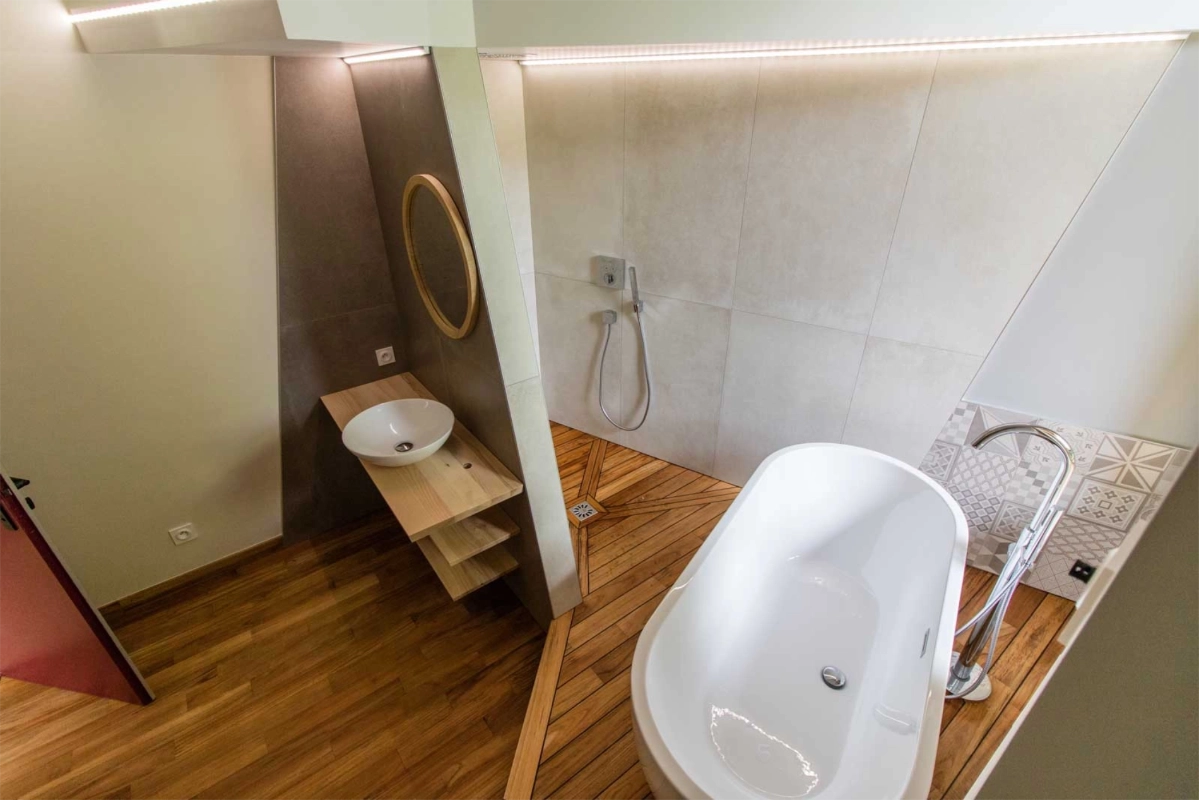 La rénovation d'une salle de bains nécessite un forte expérience, c'est tout aussi vrai pour une grande salle de bain. L'aménagement est un point clef pour ne pas tomber dans le piège la pièce d'eau "hall de gare". C'est parfaitement réussi pour cet aménagement avec la création d'une zone humide délimitée par son estrade. Un faux plafond stylisé vient "casser" la grande hauteur sous plafond et rendre l'espace douche un plus intime. la baignoire ilot a toute sa place dans ce genre d'espace. Une rénovation à Uriage, signée Ar'intérieur, artisan spécialiste salle de bain.